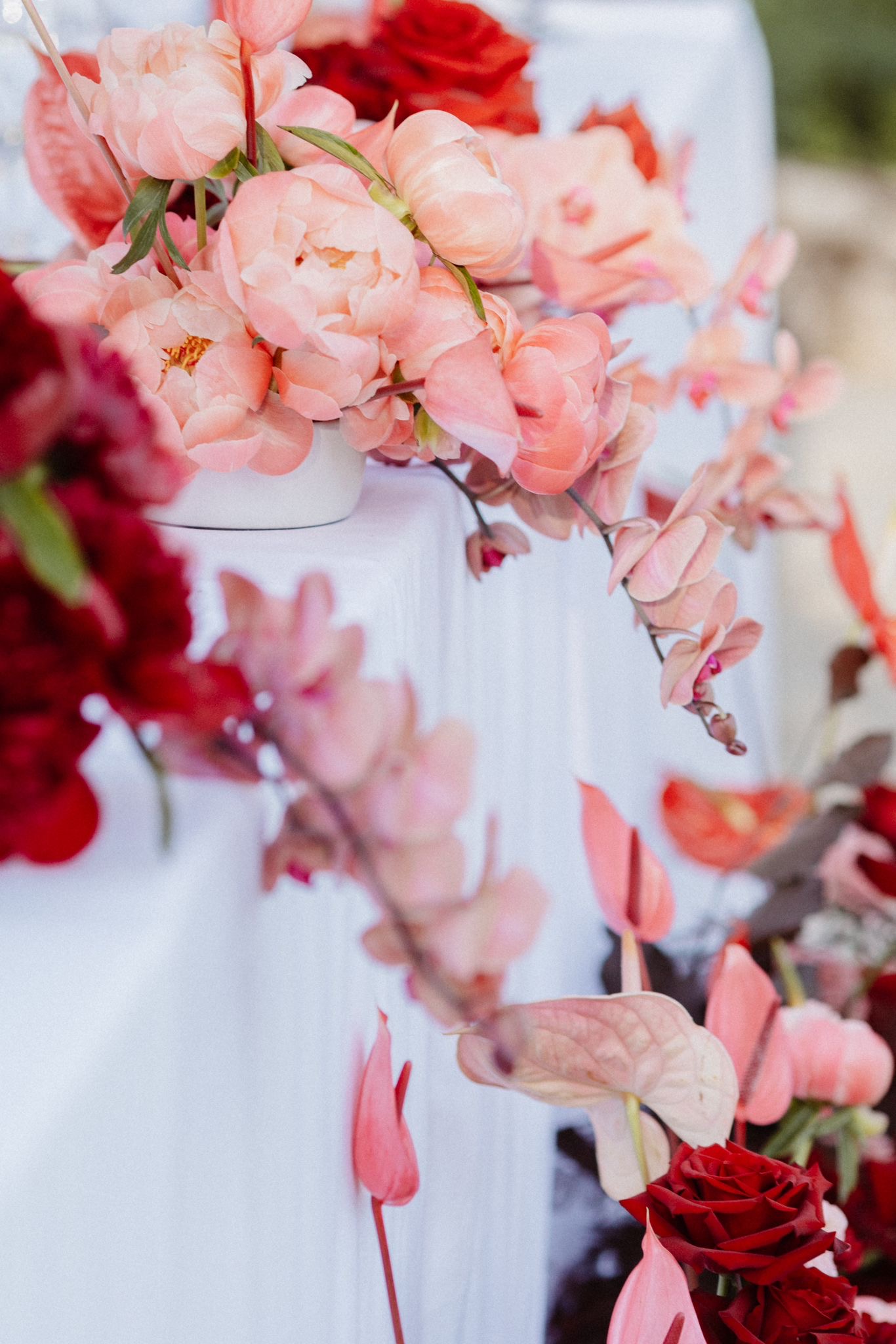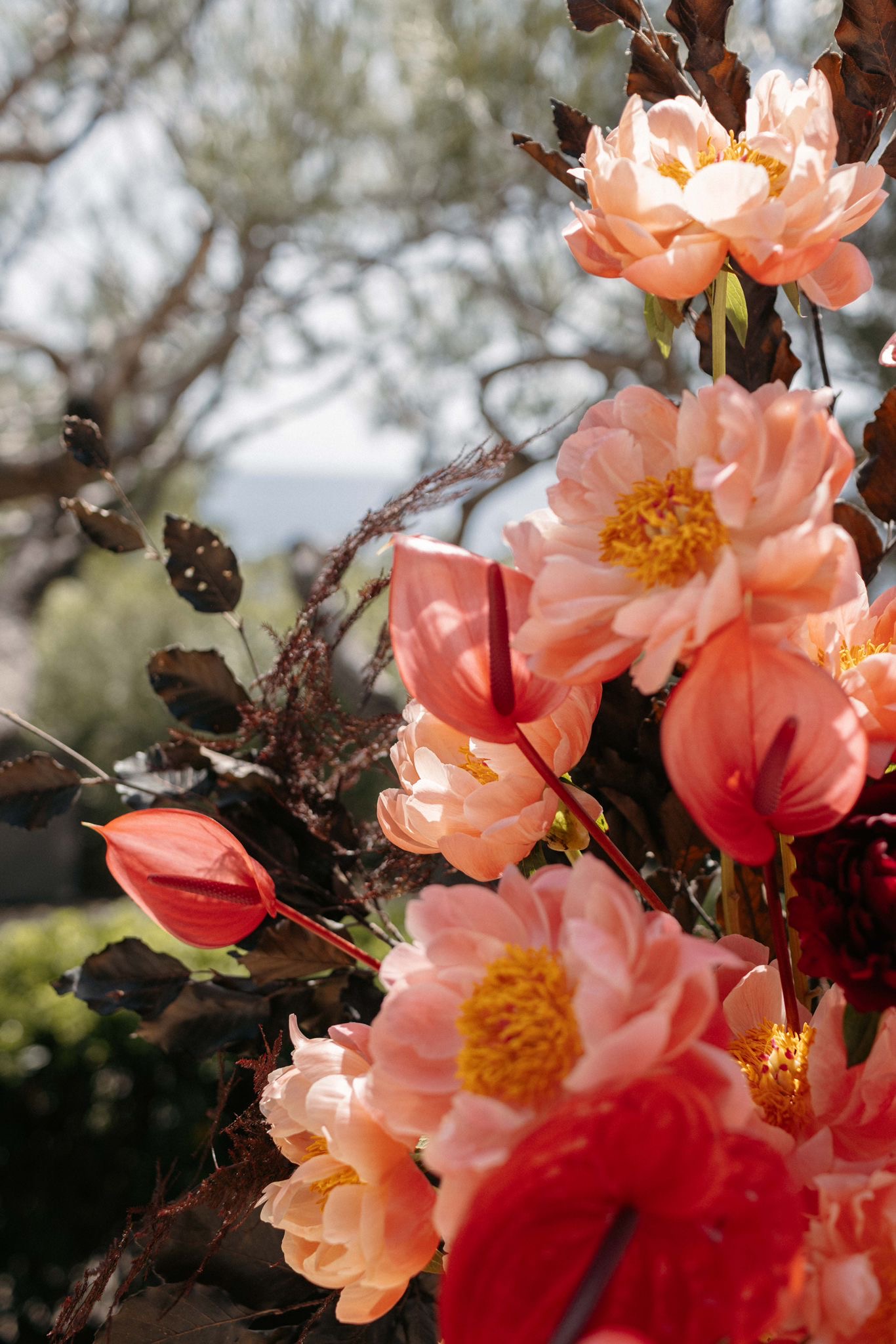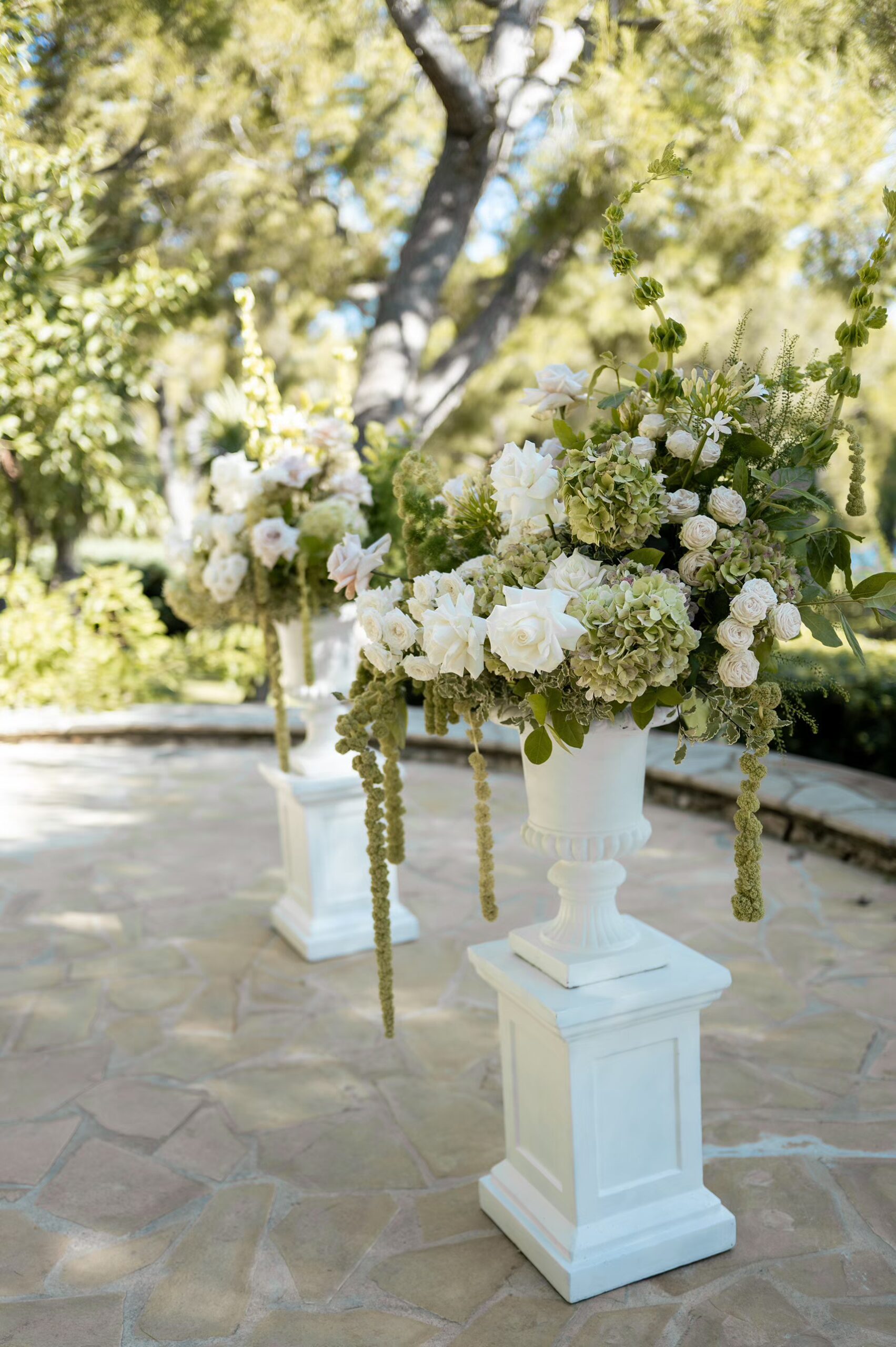 For the ceremony space, we styled timeless urns with a refined contemporary floral selection. Lush yet graphic, the arrangements featured linear molucella flowers paired with gentle, effortless blooms, creating a design that felt architectural while remaining soft and romantic within the coastal setting.