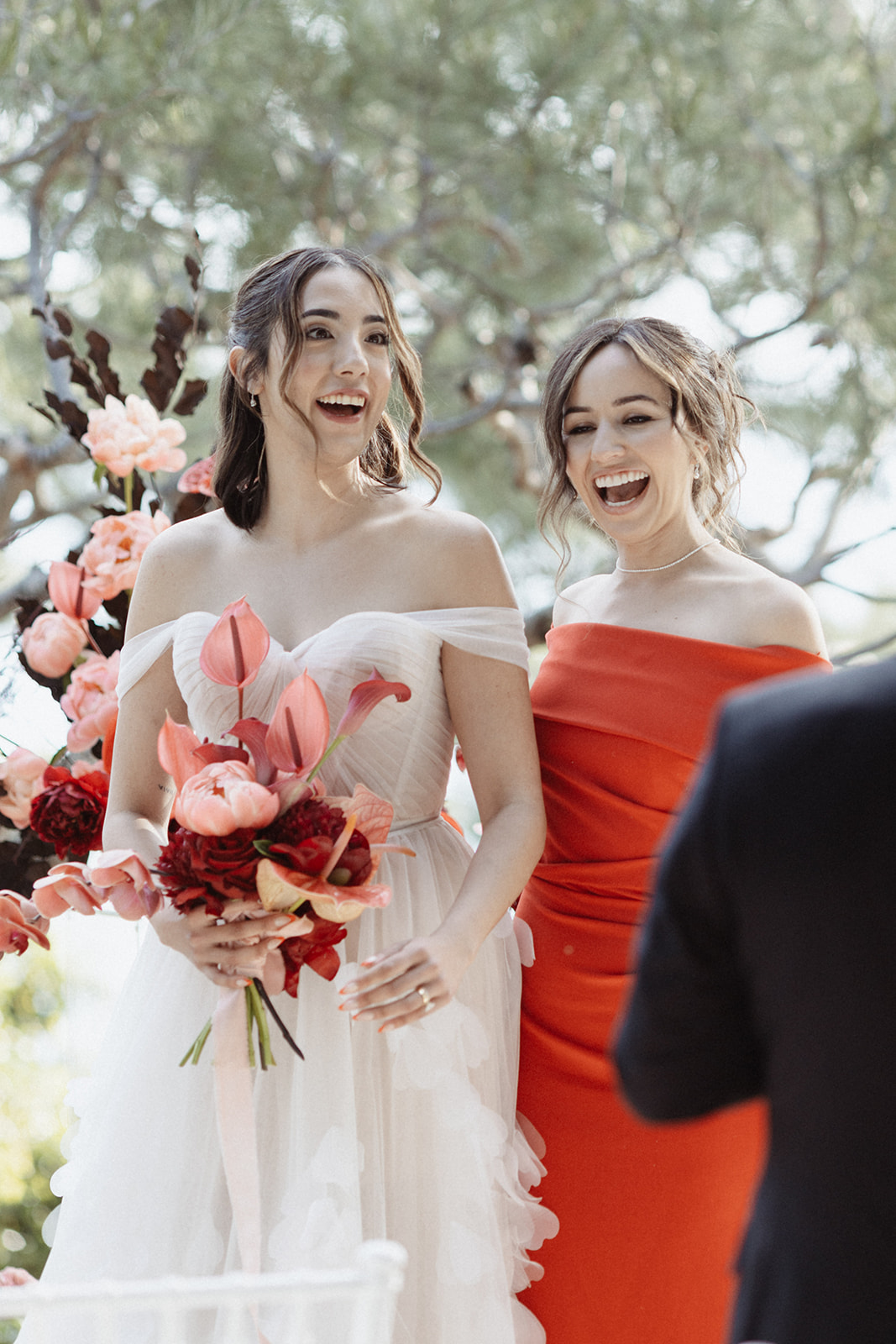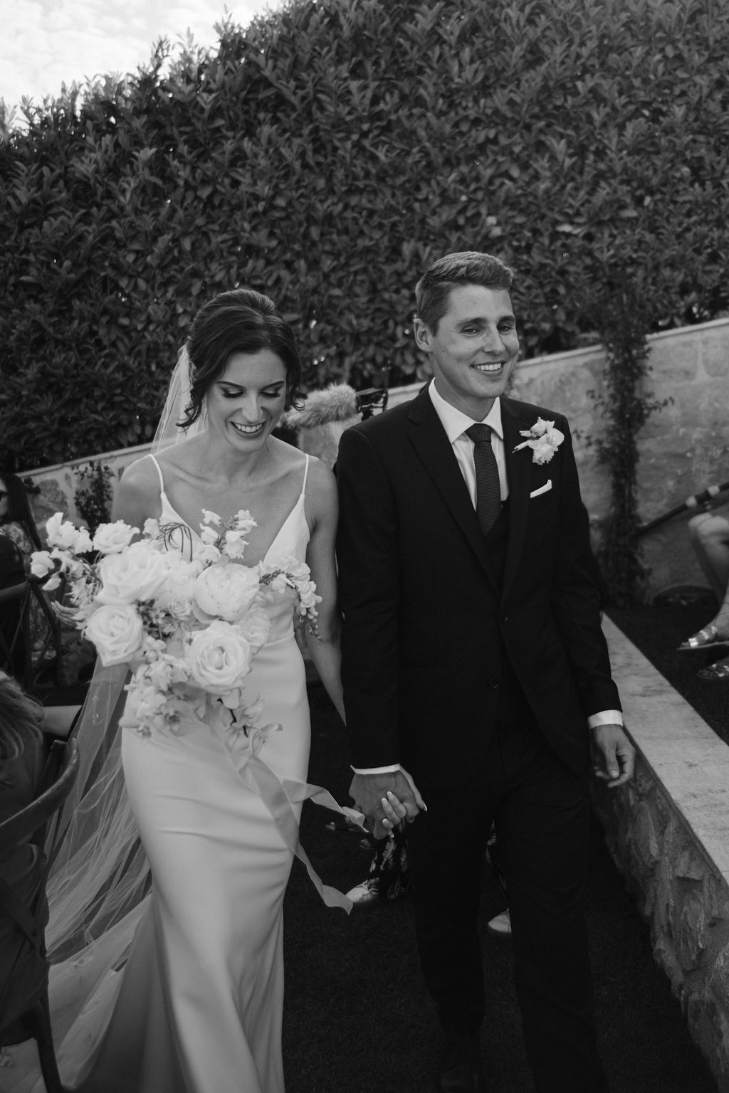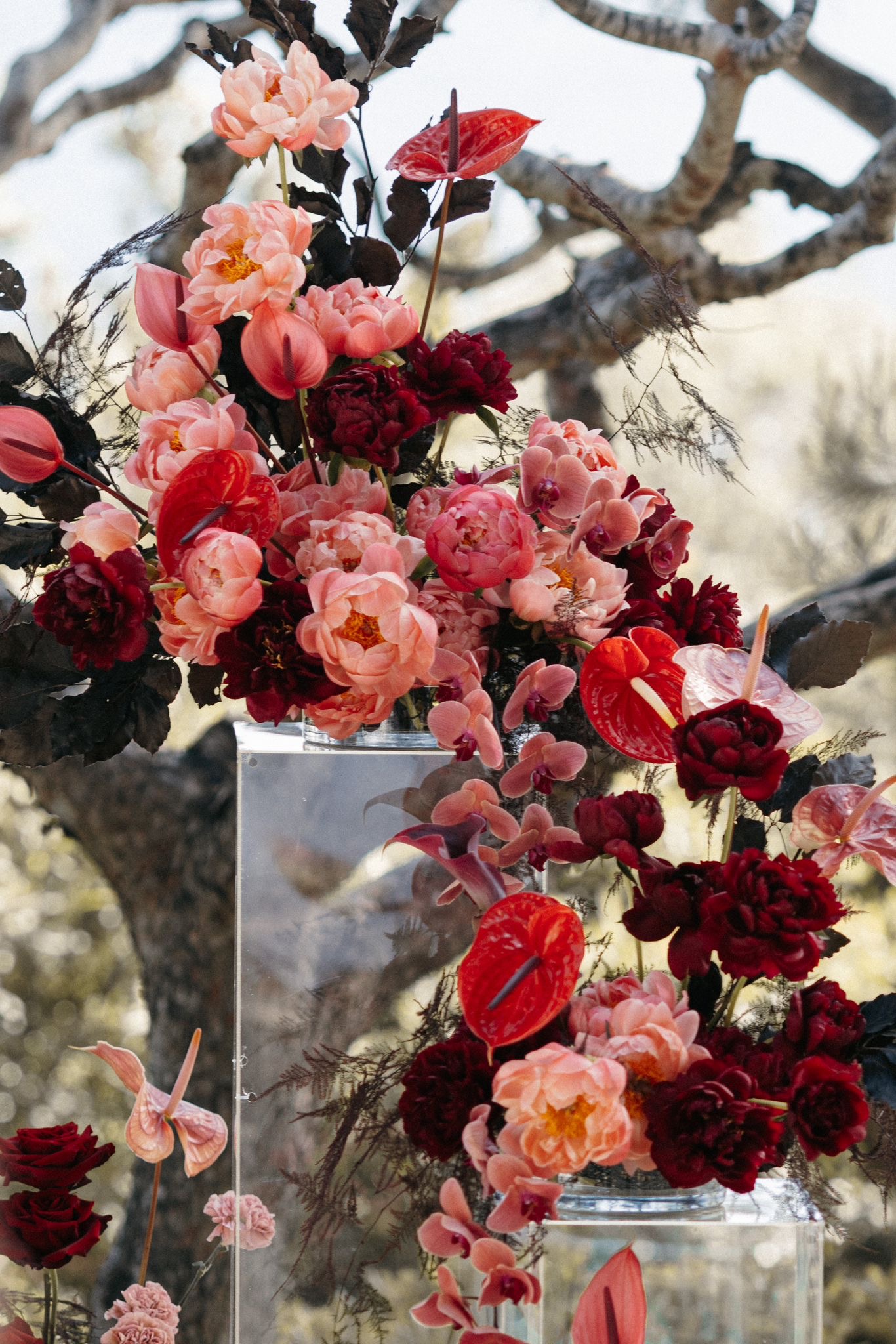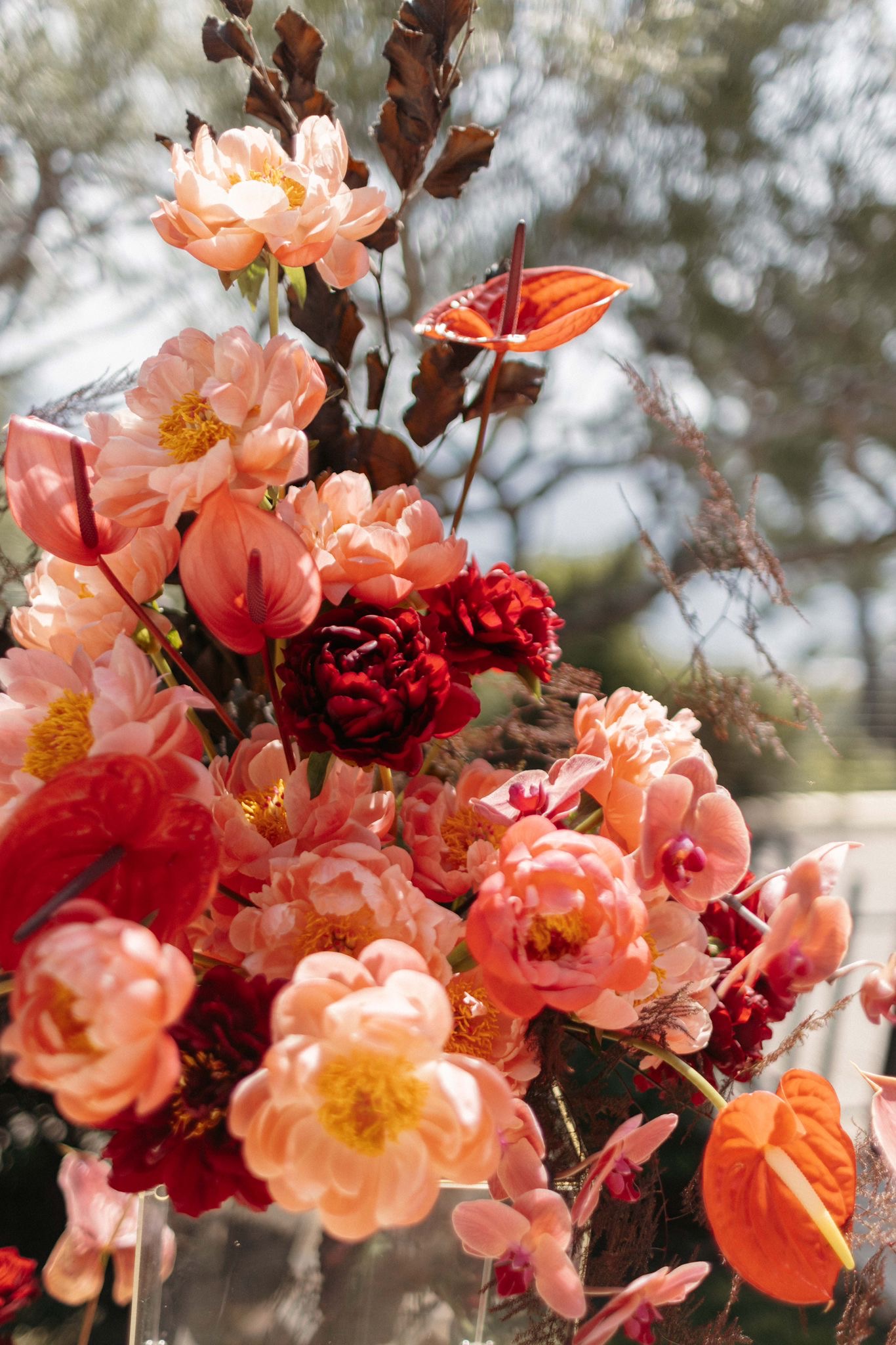 For the ceremony space, we styled timeless urns with a refined contemporary floral selection. Lush yet graphic, the arrangements featured linear molucella flowers paired with gentle, effortless blooms, creating a design that felt architectural while remaining soft and romantic within the coastal setting.