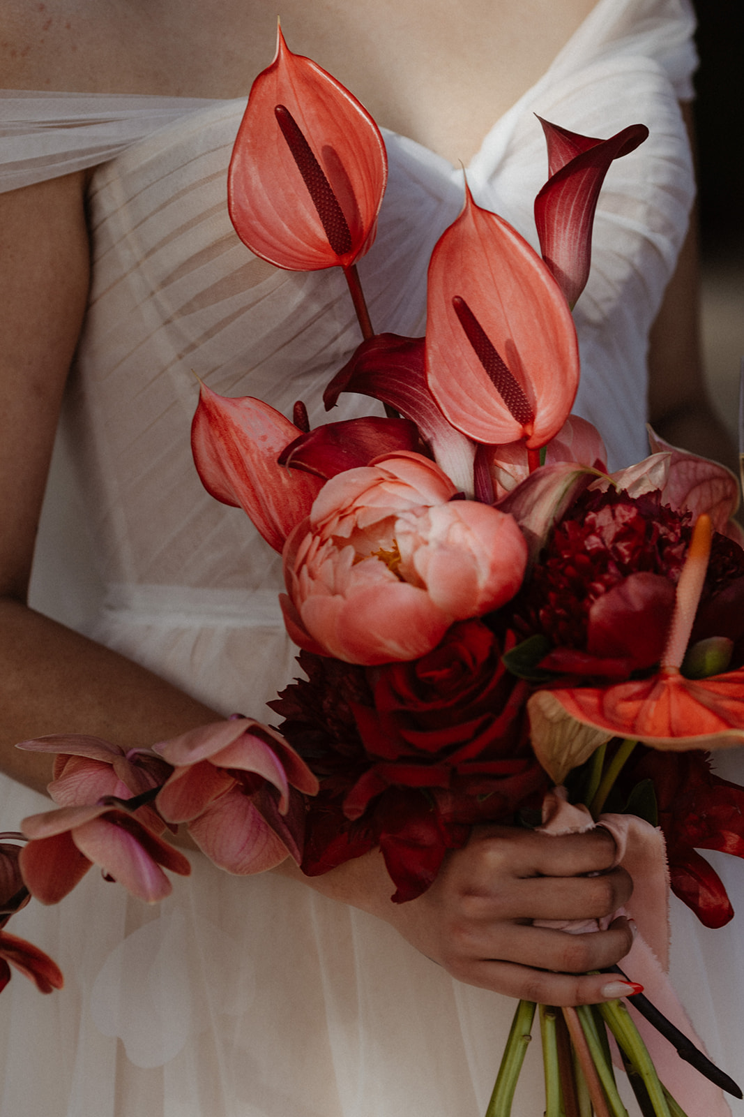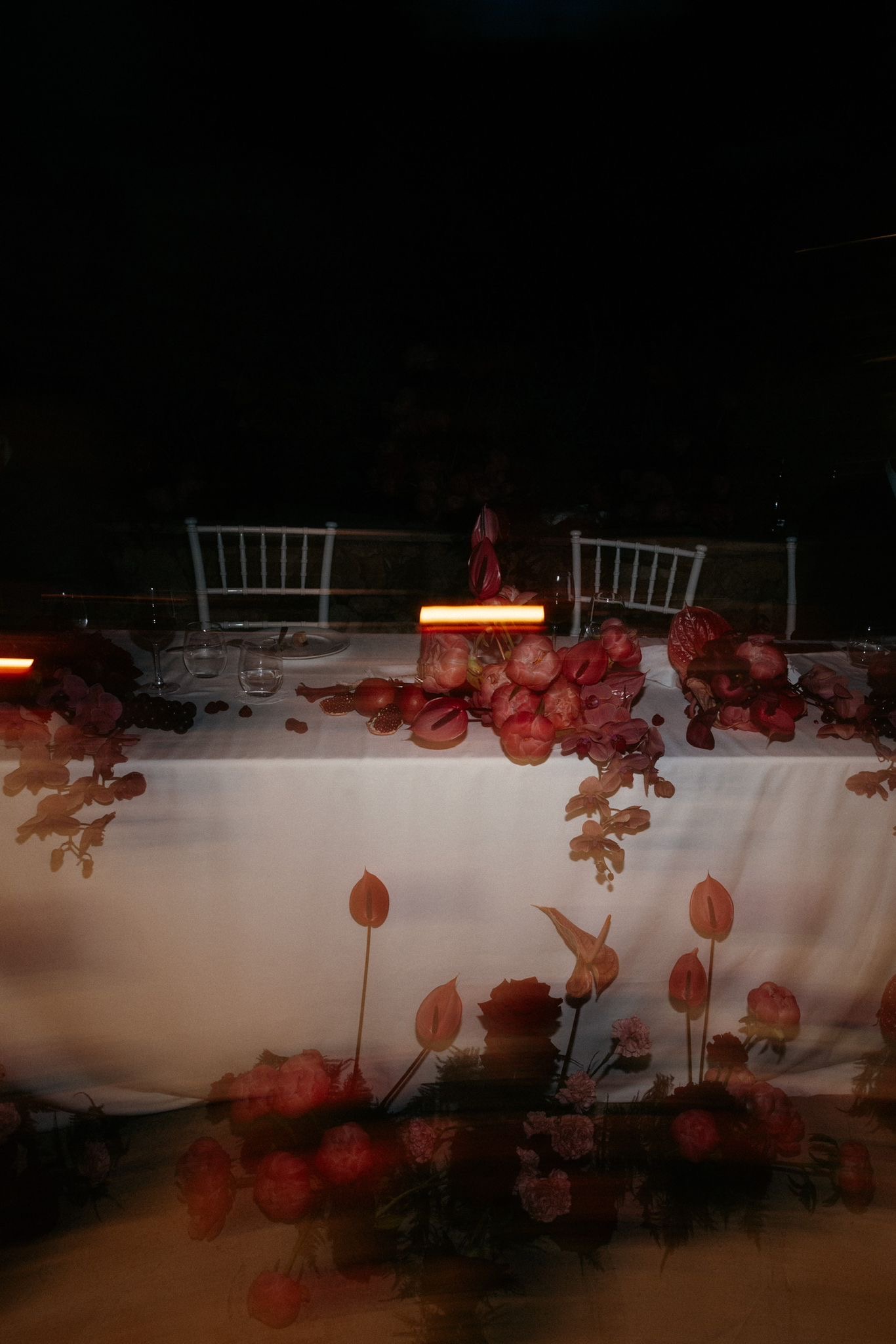 Floral installations continued throughout the venue, with fountain and bar decor thoughtfully designed to elevate each space. The reception tables were styled with light floral arrangements and candlelight, embracing understated sophistication. The look was completed with a sculptural bridal bouquet of white calla lilies — modern, confident, and beautifully refined.